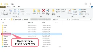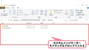 Indicatorsフォルダのなかに、カスタムインジケーターをドラッグ&ドロップで入れます。